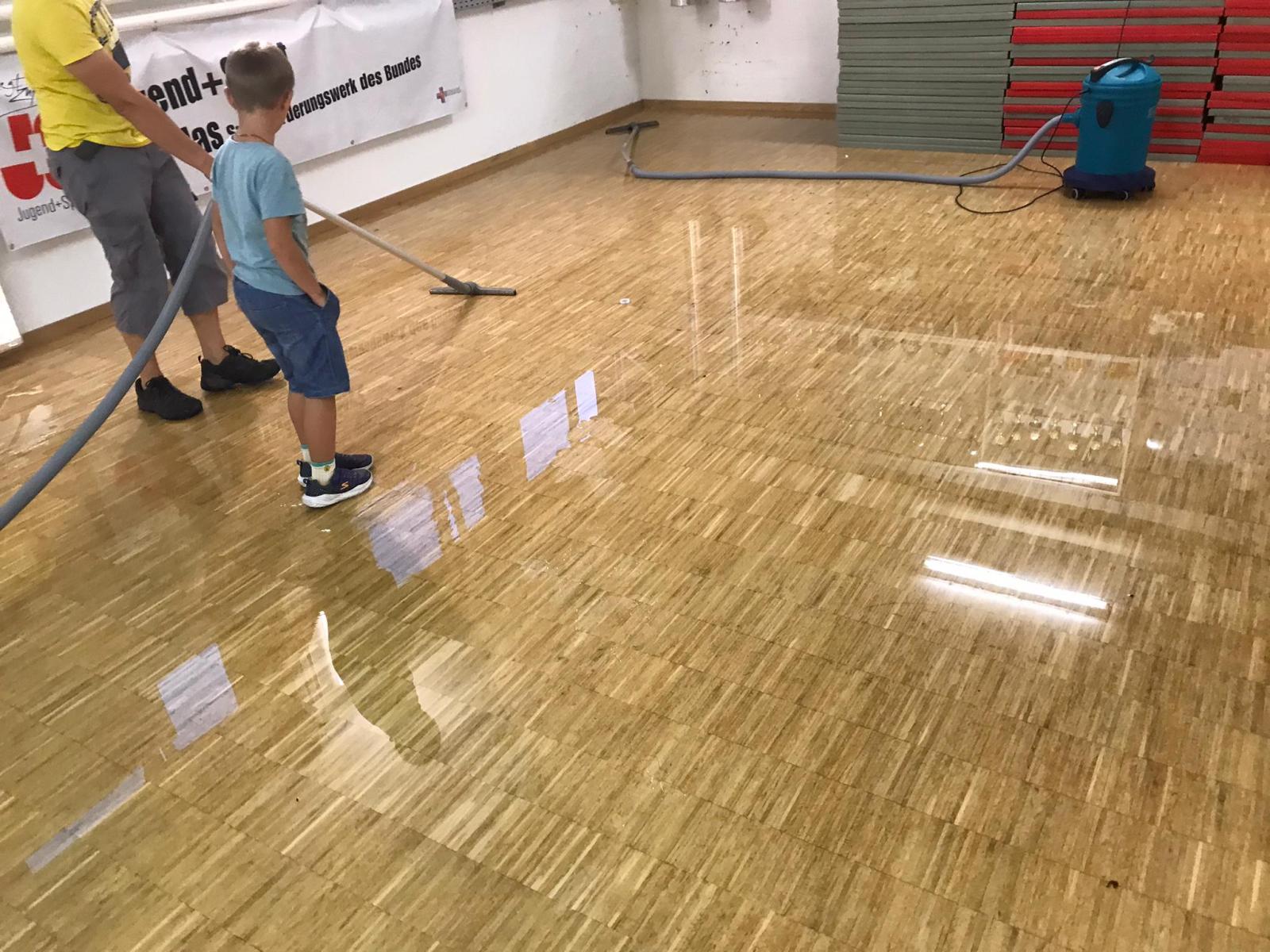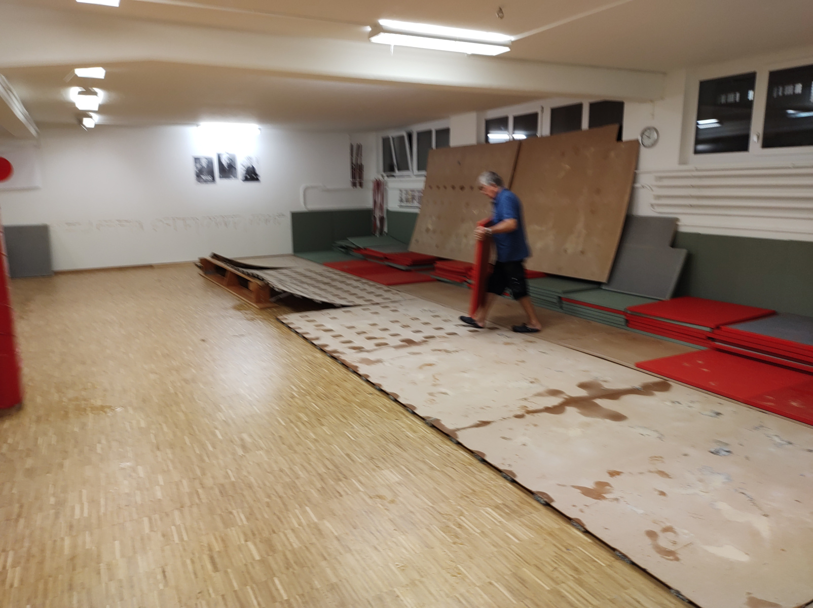 Am Sonntag Abend halfen dann Kurt, Matias, Sven, Maurus und Marvin beim provisorischen einrichten des Dojos, damit am Montag wieder trainiert werden konnte.